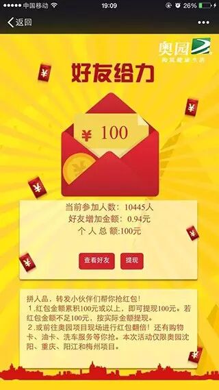 3、朋友圈有不少跟好友合体抢红包的活动,要求达到一定金额,比如100块,才能提现。