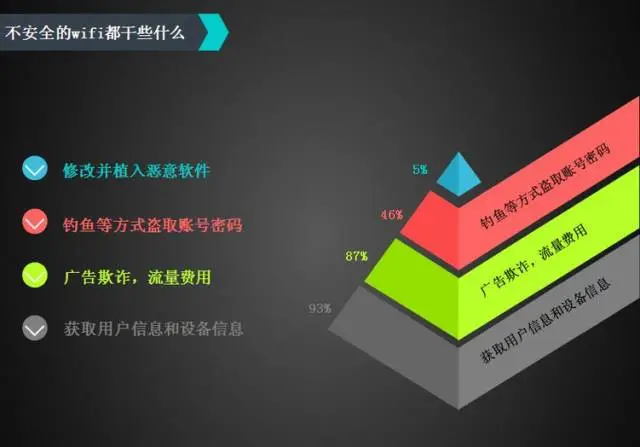 而在被判定为不安全的Wi-Fi信号93%存在着获取用户信息和设备信息的情况,87%存在广告欺诈和产生流量费用,46%能以钓鱼等方式盗取账号密码,5%会修改并植入恶意软件。