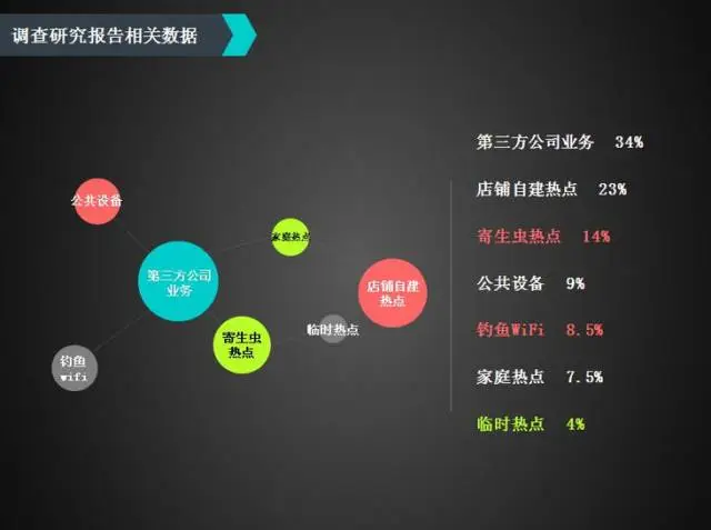 测试结果显示,在所有的Wi-Fi信号中,有34%为第三方公司业务,23%为店铺自建热点、14%为寄生虫热点,9%为公共设备,8.5%为钓鱼Wi-Fi,7.5%为家庭热点,4%为临时热点。